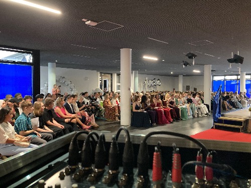 Viel Lob, so manche zwiespältige Erinnerung oder auch anekdotische Anmerkung kam in den Ansprachen und Glückwunschadressen der Klassenlehrinnen und -Lehrer und Elternvertreterinnen zum Vorschein, manche heiter oder wehmütig, andere zum Nachdenken geeignet. Und von ganzem Herzen ging viel Dank der ehemaligen Schülerinnen und Schüler an Eltern, Lehrkräfte und Therapeuten. Alles war unterhaltsam in ein vielseitiges Bühnenprogramm eingebettet in Regie und mit Moderation der Entlassschüler.